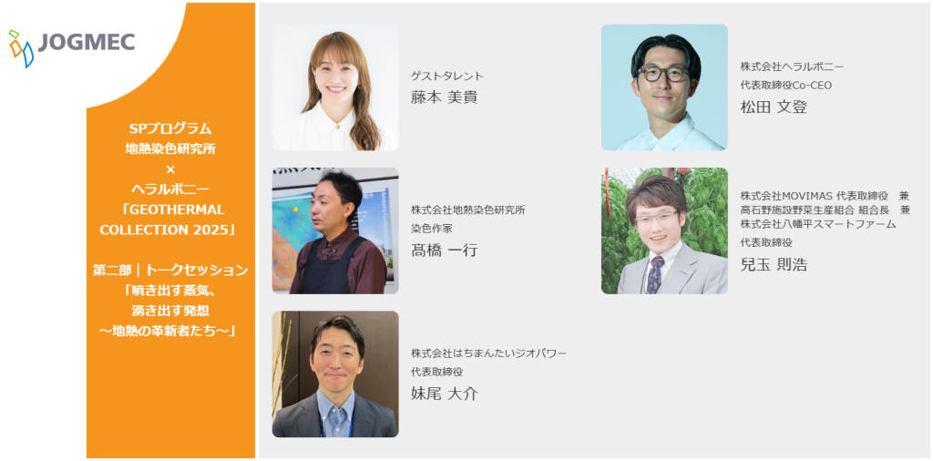 トークセッションでは、岩手をはじめ、全国や世界で取り組まれている地熱活用の好事例を伝達。地熱発電が実際の暮らしにどんな恩恵をもたらしてくれているのかを可視化することで理解を促進していただくことを目指しています。