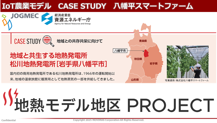石油・天然ガス、金属鉱物、石炭および地熱の安定的かつ低廉な供給に資することなどを目的として業務を行っている独立行政法人エネルギー・金属鉱物資源機構(本部:東京都港区、理事長:髙原 一郎)が主催する「第13回地熱シンポジウムin岩手」に、あらゆるモノがインターネットにつながる「IoT」を活用したクラウド制御システム開発を手掛ける株式会社MOVIMAS(モビマス、本社:東京都千代田区、代表取締役兒玉則浩、以下MOVIMAS)と地熱を活用した熱水ハウスを再生する岩手県・八幡平市(市長:佐々木孝弘、以下八幡平市)のIoT農業の振興を目的とした協定締結から、農地法に定める農地所有適格法人として設立した株式会社八幡平スマートファーム(本社:岩手県八幡平市、代表取締役:兒玉則浩、以下八幡平スマートファーム)代表取締役兒玉則浩がクロストーク出演で登壇いたしましたのでお知らせします。